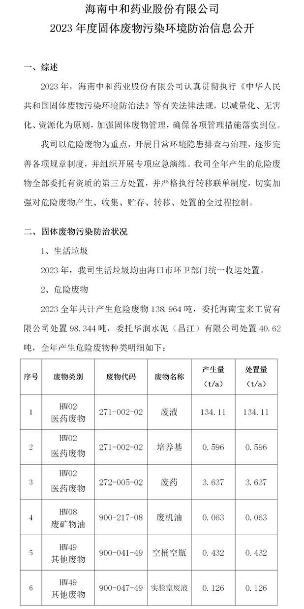 海南中和藥業(yè)股份有限公司固體廢物污染環(huán)境防治信息公開(2023年度)