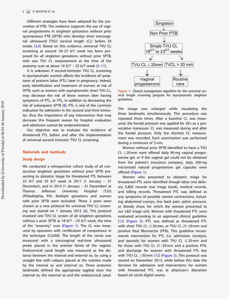研究設(shè)計:這是一項回顧性隊列研究,研究對象是2011年(1月1日至12月31日)和2014年(1月1日至12月31日)因先兆早產(chǎn)在Thomas Jefferson大學(xué)醫(yī)院(TJU)(賓夕法尼亞州費城)就診的所有孕23 + 0/7至33 + 6/7周之間且既往無SPTB的單胎妊娠孕婦。自2012年1月1日開始起的兩年中開展TVU