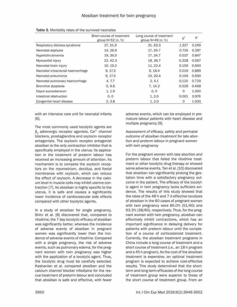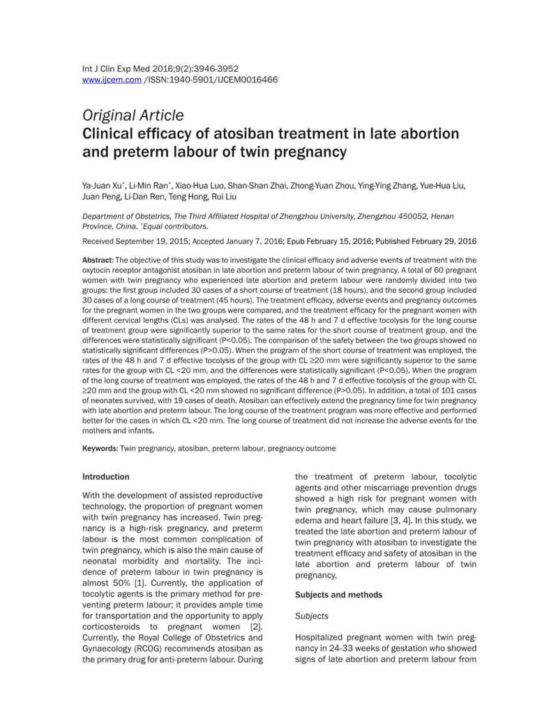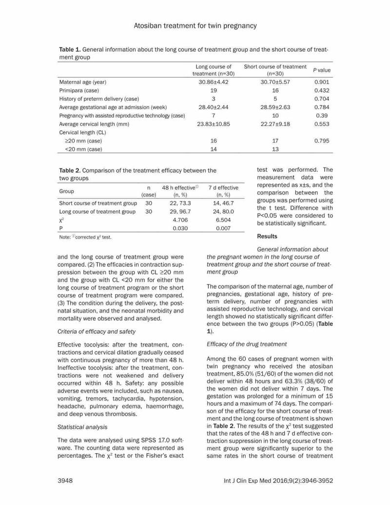 結(jié)論:阿托西班可有效延長晚期流產(chǎn)以及早產(chǎn)的雙胎妊娠的妊娠時間。對于宮頸長度<20mm的病例,長療程治療更有效,效果更好。長期治療不會增加母嬰的不良反應(yīng)。
