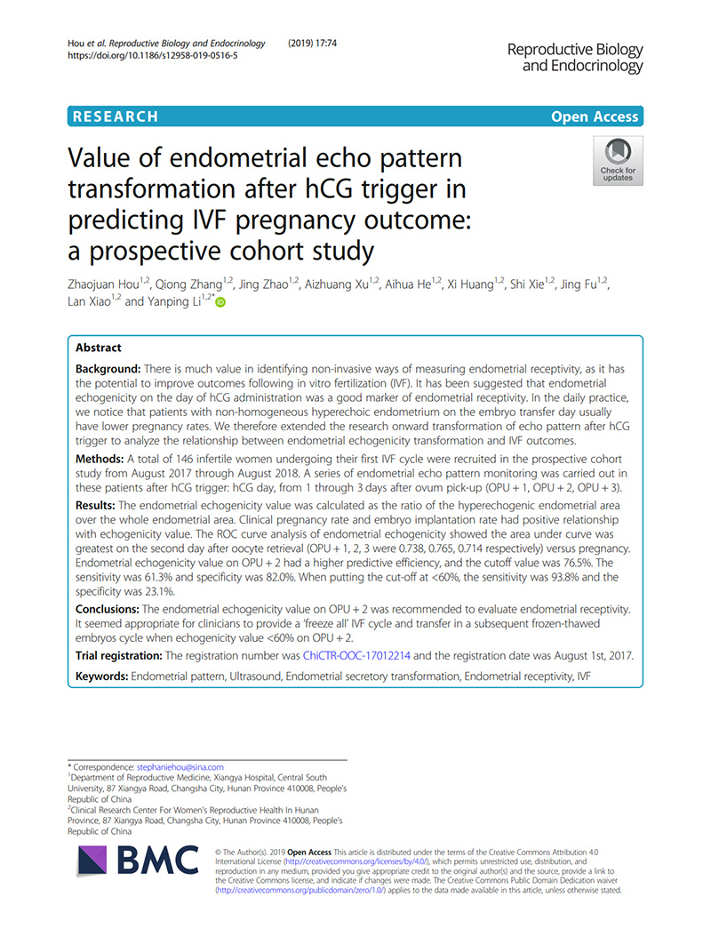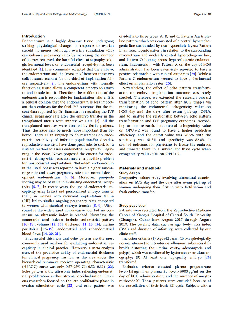 背景:非侵入性測(cè)量子宮內(nèi)膜容受性的方法很有價(jià)值,因?yàn)樗锌赡芨纳企w外受精(IVF)結(jié)局。有人認(rèn)為hCG給藥當(dāng)天的子宮內(nèi)膜回聲是子宮內(nèi)膜容受性的良好標(biāo)志。在日常實(shí)踐中,我們注意到胚胎移植日子宮內(nèi)膜非均質(zhì)高回聲的患者通常妊娠率較低。因此,我們將延伸擴(kuò)展了hCG觸發(fā)后子宮內(nèi)膜回聲模式轉(zhuǎn)化的研究,以分析子宮內(nèi)膜回聲改變與IVF結(jié)局之間的關(guān)系。