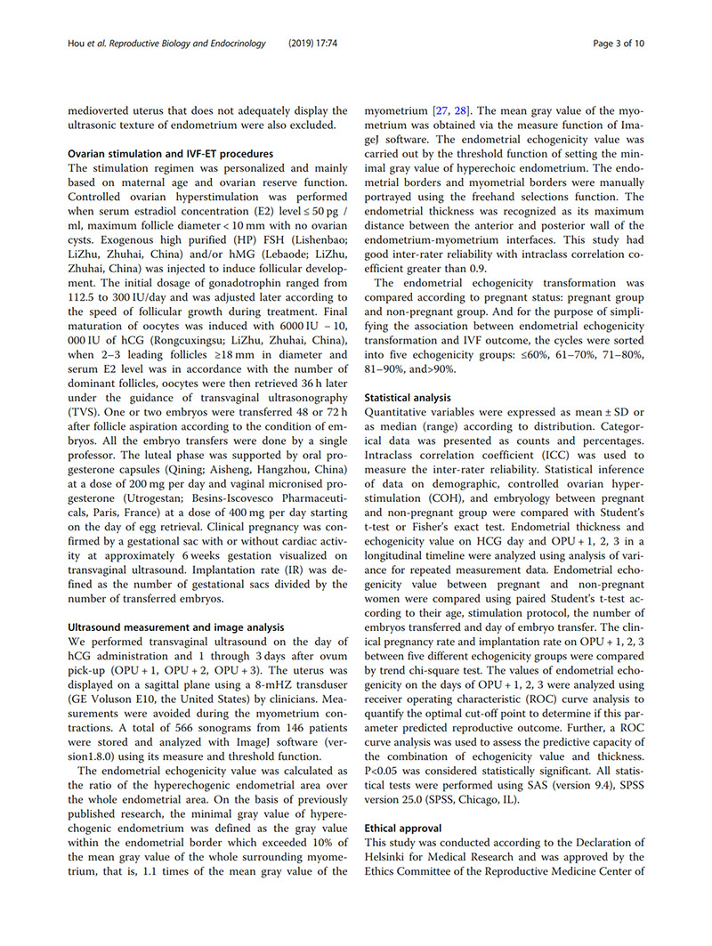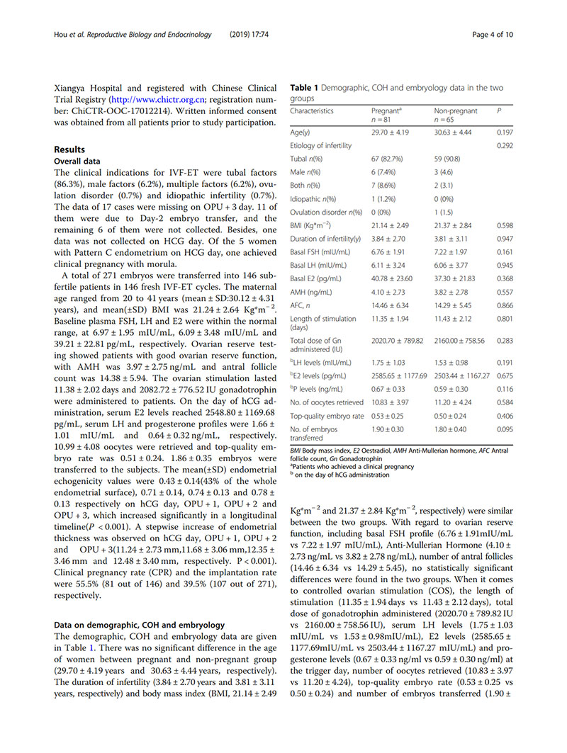 方法:在2017年8月至2018年8月,前瞻性隊(duì)列研究共招募了146名首次接受體外受精周期的不孕女性。監(jiān)測(cè)這些患者在hCG日和取卵后1-3天(OPU + 1, OPU + 2, OPU + 3)的子宮內(nèi)膜回聲模式。
