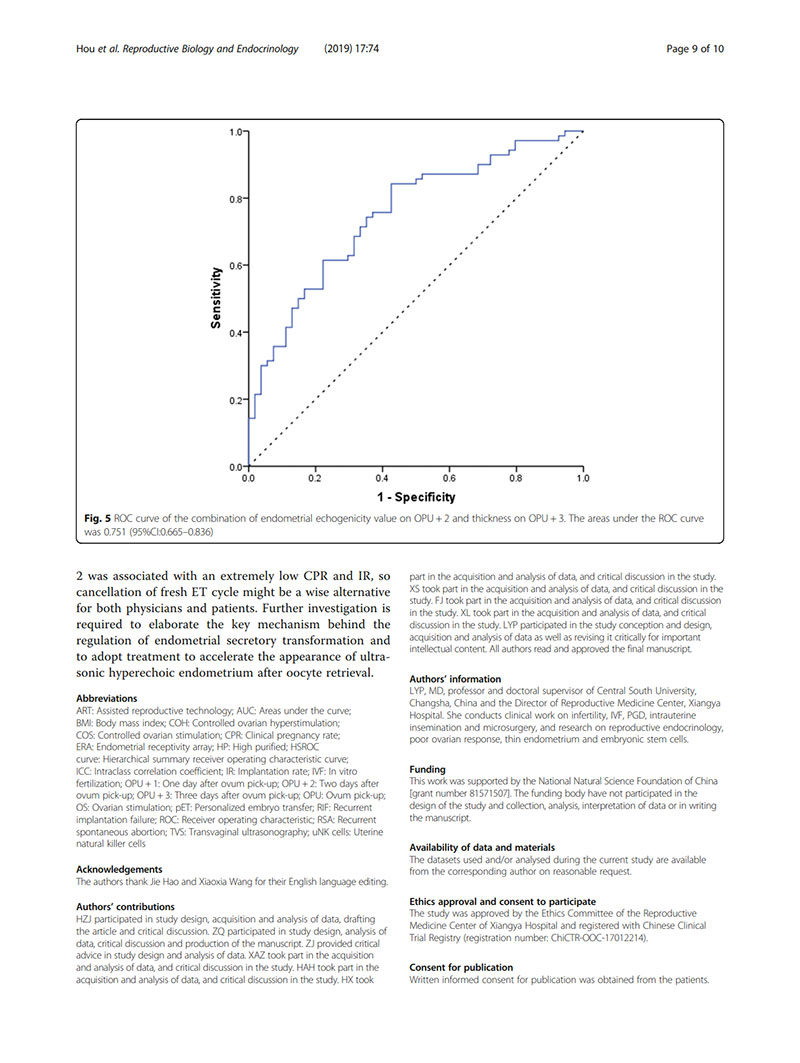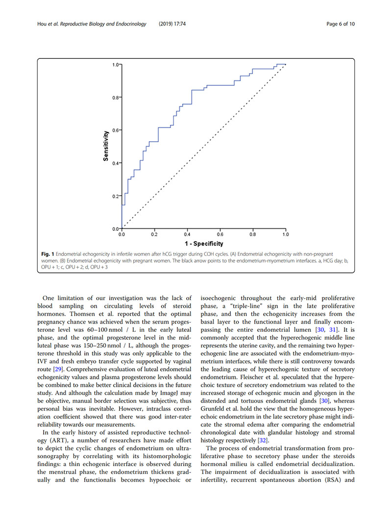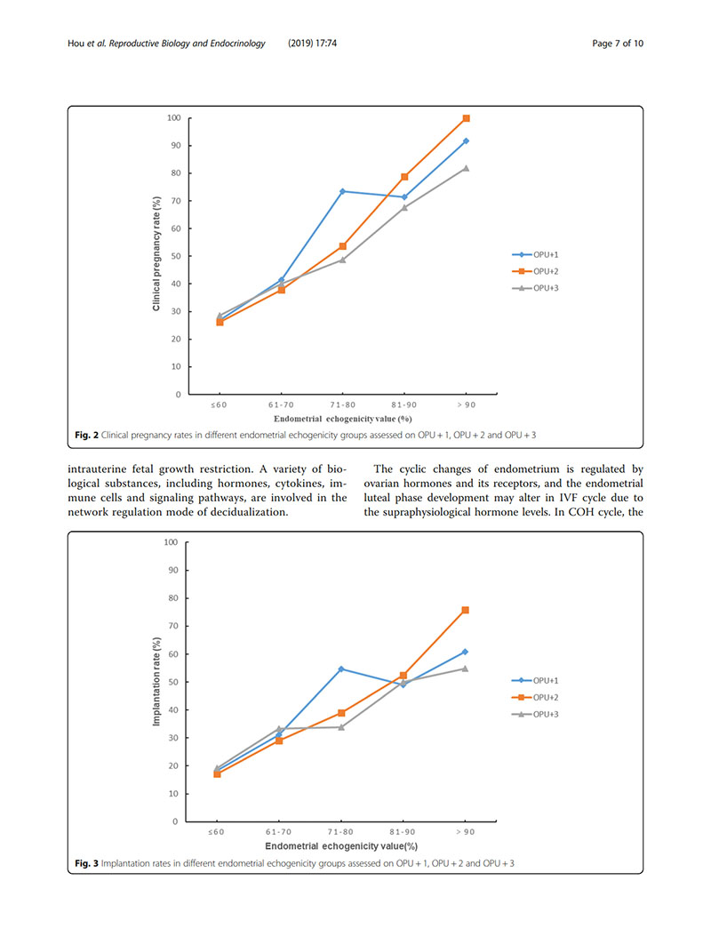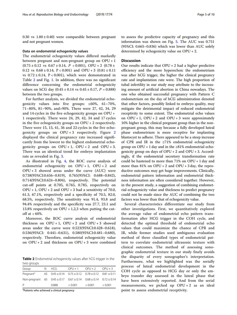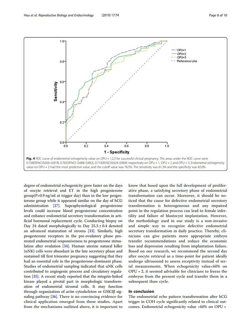 結(jié)論:建議用取卵后第2天(OPU+2)的子宮內(nèi)膜回聲值評(píng)價(jià)子宮內(nèi)膜容受性。當(dāng)OPU+2的回聲值<60%時(shí),臨床醫(yī)生似乎適合提供“全冷凍”IVF周期,并在隨后的凍融胚胎周期中進(jìn)行移植。