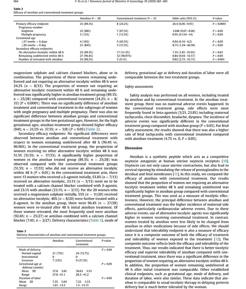 結(jié)論:我們的研究結(jié)果支持阿托西班對(duì)比目前常規(guī)治療是更為先進(jìn)的宮縮抑制劑,尤其是對(duì)于高孕齡者。